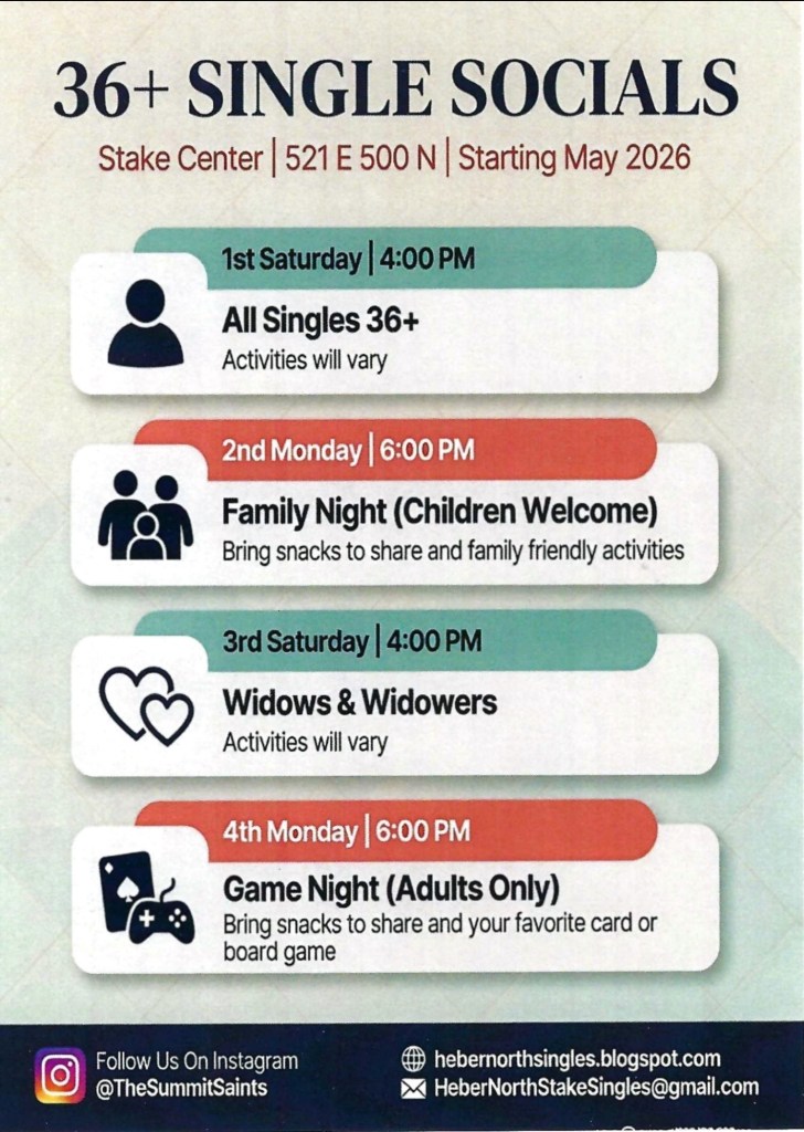View Ward, Stake, Heber Young Single Adults (YSA), and Multi-Stake Single Adult Council announcements on this week’s digital bulletin board.